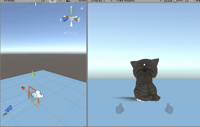 この座標はこれまでのカメラ座標(HoloLens をかけている人の位置)の代わりに、 FixedUpdate() と LateUpdate() のねこモデルの向きを変える処理の中で利用するようにしています